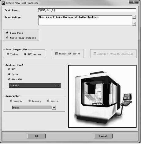 (2)新建一個(gè)后處理。在新建后置處理“Creat New Post Processor”對話 框 中 ,Post Name 為 FANUC_ 0i _D,輸出單位“Post Output Unit”設(shè)置為米制,機(jī)床類型選擇 Lathe(車床),機(jī)床控制系統(tǒng)從Library中選擇FANUC,如圖2所示,控制系統(tǒng)的選擇非常重要,一定要正確選擇所用數(shù)控系統(tǒng)。