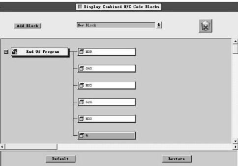 (7)定義數(shù)控程序結(jié)束程序段。其中包括取消刀具補(bǔ)償(M40),關(guān)閉切削液(M09),主軸停轉(zhuǎn)(M05),主軸 Z 方向回原點(diǎn),以便檢查工件加工質(zhì)量,如圖7所示。